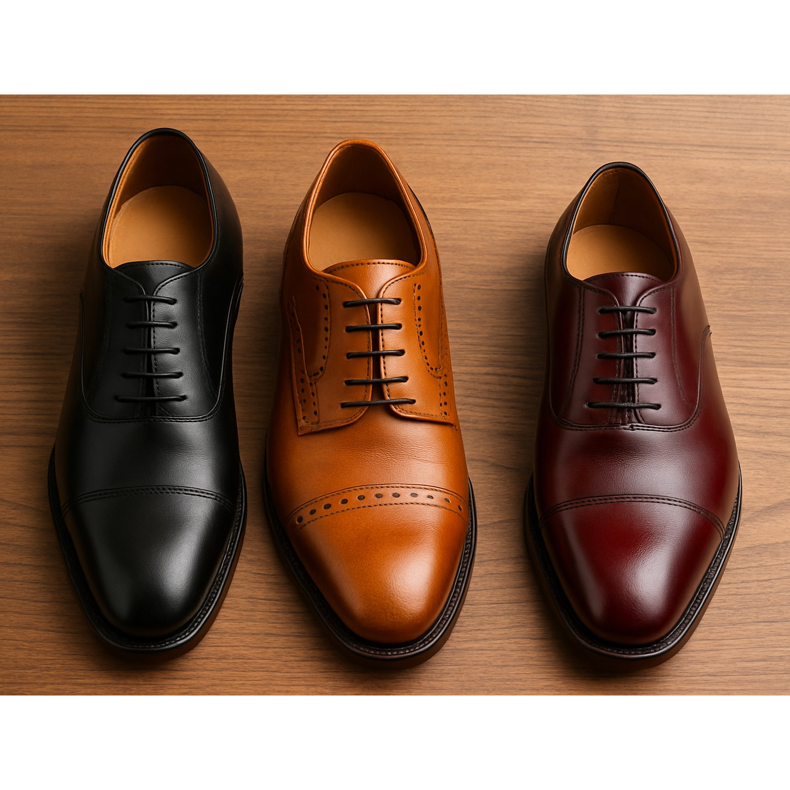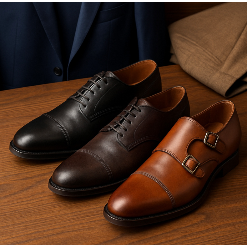 Scarpe derby, francesine, monaci cinturini, mocassini. Colori: marrone, bordeaux, blu navy.