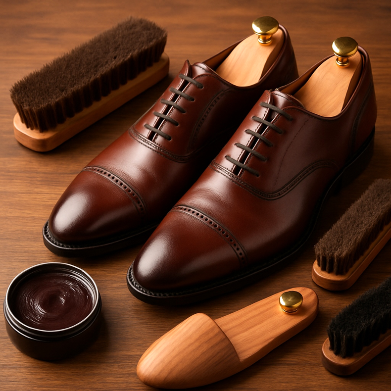 Crema per scarpe nel colore giusto. Strofinare e lucidare fino a quando diventa lucido.