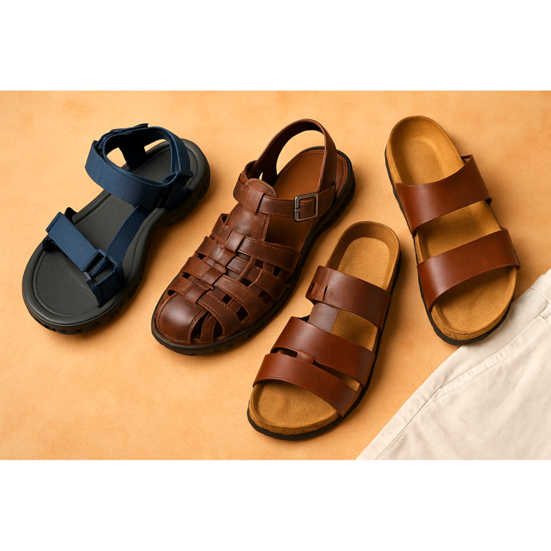 I sandali da uomo sono le calzature estive più ariose, perfette per le giornate calde. I modelli sportivi (Teva, Merrell, Keen) con cinghie regolabili e suola profilata sono perfetti per le attività all'aperto: escursionismo, kayak, spiaggia. I sandali minimalisti in pelle (Birkenstock, sandali slide) si abbinano a stili urbani casual: pantaloncini, pantaloni corti, pantaloni di lino. I sandali da pescatore realizzati in pelle intrecciata sono un'elegante opzione estiva dal carattere mediterraneo. Indossateli a piedi nudi o con calzini invisibili. Scegli sandali regolabili per vestibilità e comfort ottimali. Evita di indossare sandali in ufficio con un codice di abbigliamento formale.