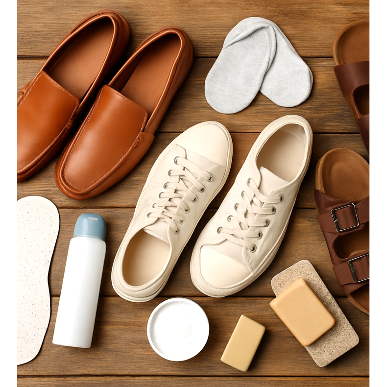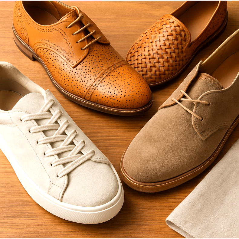 La pelle traforata (broguing, punchhole) non solo aggiunge carattere alle scarpe, ma migliora anche la ventilazione. Oxford, derby e mocassini traforati sono un'ottima opzione estiva per stili più formali. La pelle scamosciata e il nabuk sono più ariosi della pelle verniciata liscia: le scarpe da ginnastica scamosciate o gli stivali da deserto funzioneranno bene quando fa caldo. La fodera leggera in lino o cotone anziché quella sintetica migliora il comfort termico. I modelli con lati aperti (pelle a trama larga, intrecciata) uniscono l'eleganza della pelle alla ventilazione dei sandali. Una suola in gomma naturale o sughero è più leggera e traspirante di una suola sintetica pesante. I colori chiari delle scarpe (beige, marrone chiaro, bianco, grigio chiaro) riflettono la luce solare e non si riscaldano tanto quanto quelli scuri.