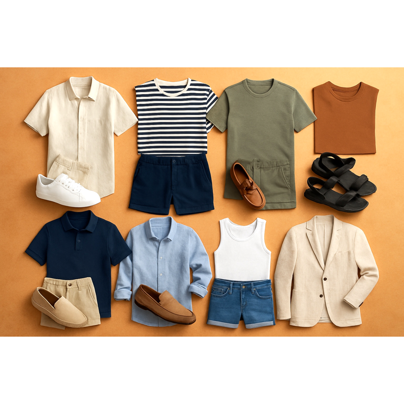 Scarpe da ginnastica bianche + pantaloni di lino + camicia di lino = classica eleganza casual estiva. Espadrillas + pantaloncini chino + polo = look da vacanza mediterranea. Sandali sportivi + pantaloncini cargo + t-shirt = stile estivo all'aria aperta. Mocassini scamosciati + pantaloni chino arrotolati + camicia con maniche arrotolate = smart casual per le giornate calde. Scarpe da barca + pantaloncini bianchi o blu navy + maglietta a righe = atmosfera nautica. Sneaker in tela + shorts in denim + canotta = streetwear urbano. Mocassini leggeri + pantaloni di lino + giacca di lino = business casual estivo. Ricordati di abbinare le tue calzature all'occasione: i sandali non sono adatti alla maggior parte degli ambienti di lavoro, anche in estate.
