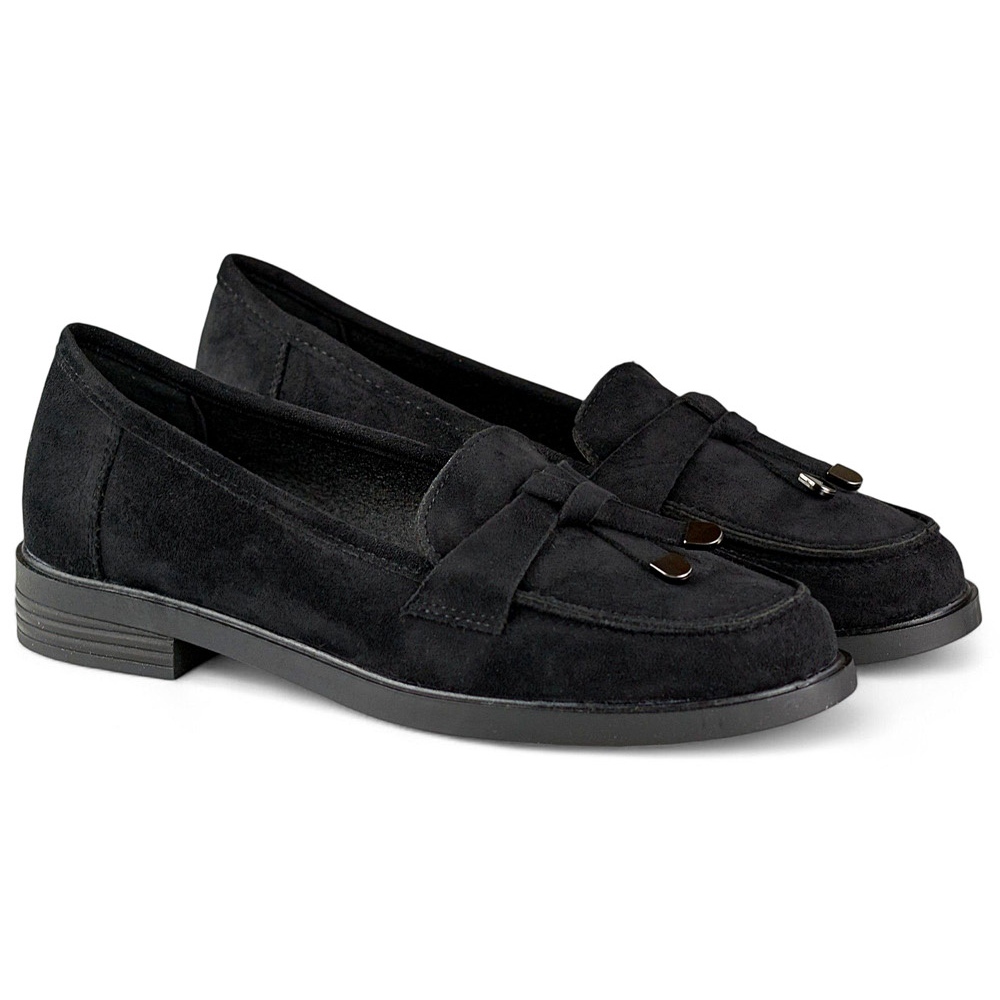La tomaia in pelle scamosciata ecologica in nero dà loro stile e il naso rotondo li rende estremamente comodi anche durante una lunga usura. Una suola piatta con un'altezza di 2,5 cm garantisce stabilità e libertà di movimento, che rende queste scarpe una scelta ideale sia su base giornaliera che per occasioni speciali.