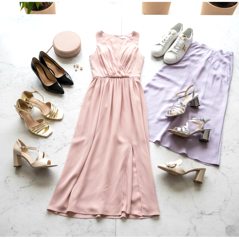 La prima regola: le scarpe devono corrispondere alla lunghezza del vestito. Puoi indossare quasi tutto con un mini abito. Tacchi a gattino, tacchi larghi e sandali bassi stanno benissimo con un abito midi. Gli abiti maxi e quelli da ballo richiedono una decisione: scarpe basse che sembrano eleganti da sotto l'orlo o tacchi alti che sollevano la figura.