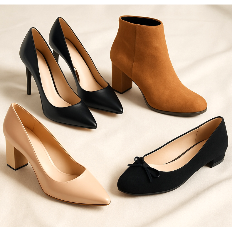 Le classiche décolleté a tacco medio sono le scarpe formali più universali per le donne. Le décolleté nere o beige si abbinano praticamente a qualsiasi stile elegante. La punta e il tallone chiusi li rendono adatti anche agli ambienti più conservativi. Il tacco largo garantisce stabilità durante gli eventi lunghi. Perfetto per l'ufficio, colloqui di lavoro e riunioni ufficiali.