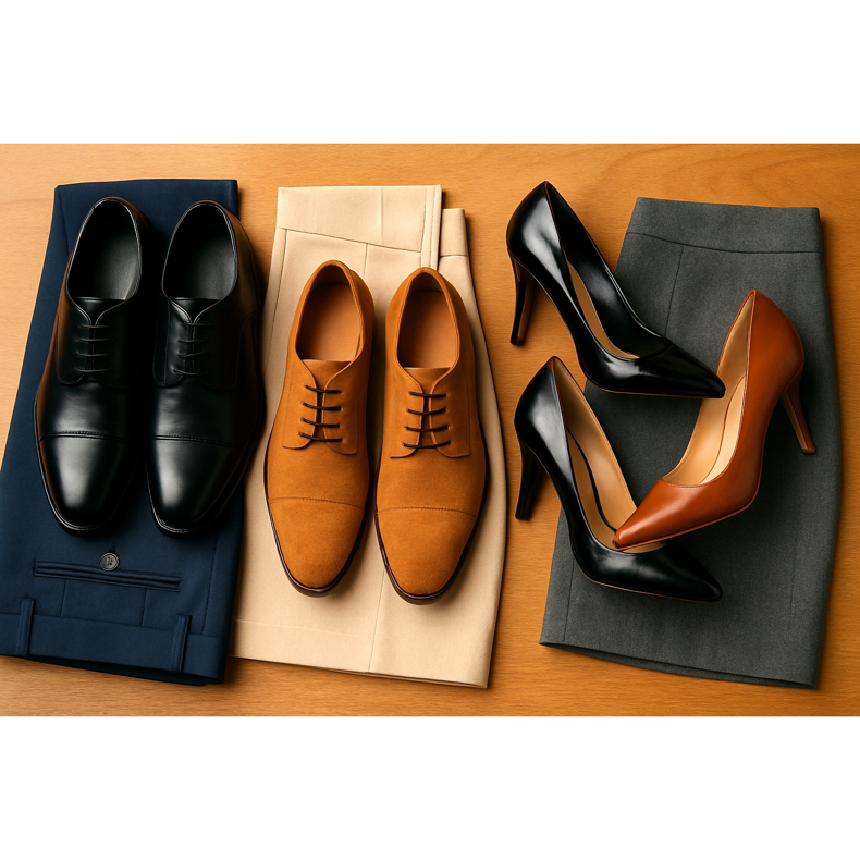 L'ambiente aziendale richiede calzature tradizionali. Gli uomini dovrebbero indossare scarpe stringate o derby nere o marrone scuro. Le donne staranno bene con le décolleté a tacco medio in colori neutri. Evita fantasie stravaganti, colori vivaci e decorazioni eccessive. La semplicità e il classico sono la chiave.