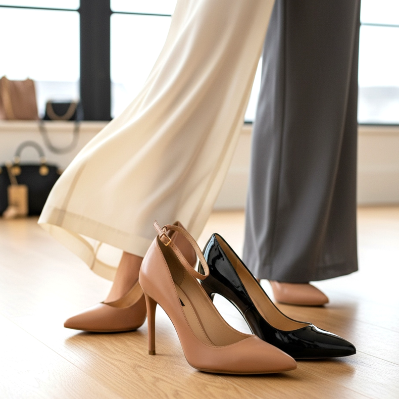 L'abbinamento più classico e sicuro è quello dei pantaloni ampi con décolleté a tacco medio o alto. Il tacco allunga le gambe e solleva la figura, bilanciando perfettamente il volume delle gambe larghe. Le décolleté con punta appuntita funzionano meglio: snelliscono otticamente il piede e aggiungono eleganza.