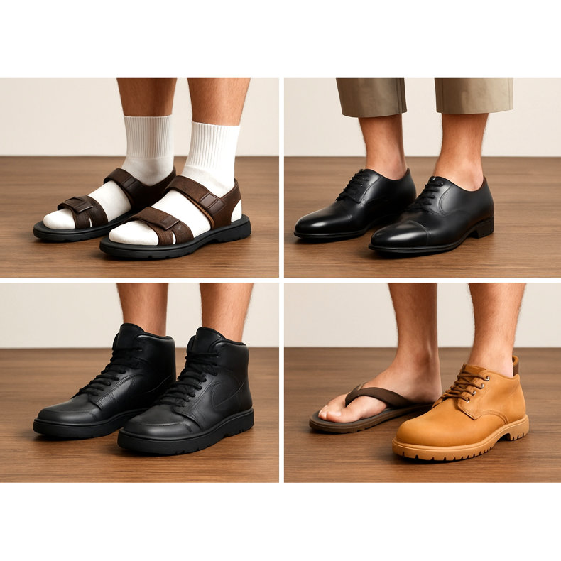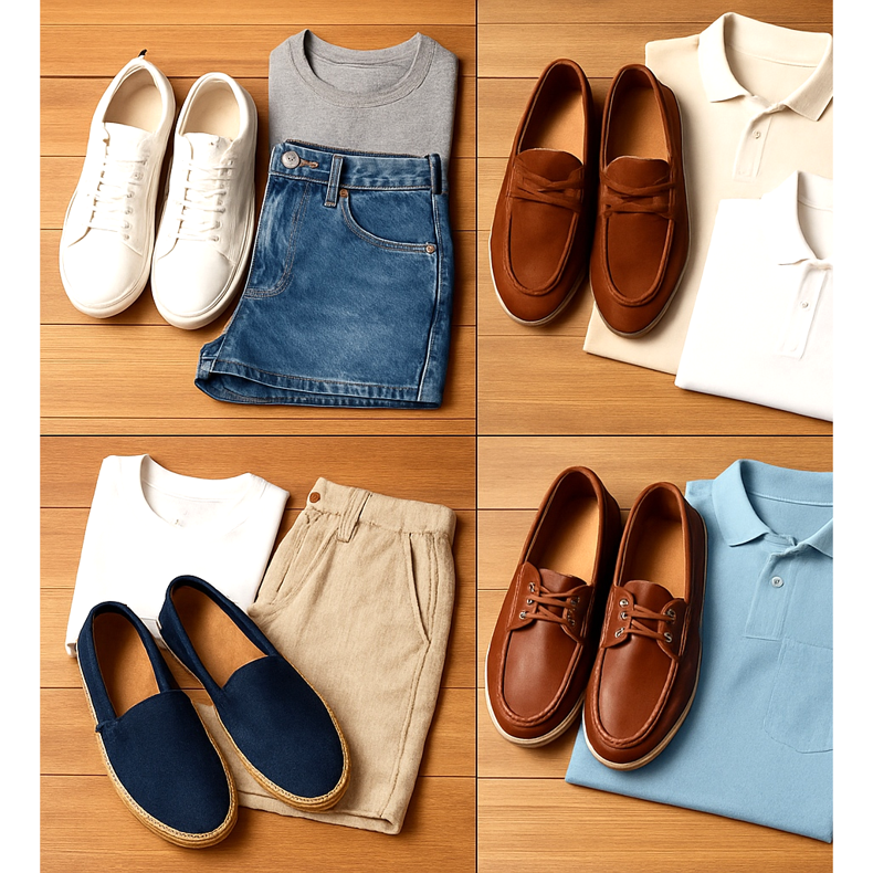Pantaloncini scuri (blu navy, kaki) → scarpe leggere (scarpe da ginnastica bianche, mocassini marrone chiaro).