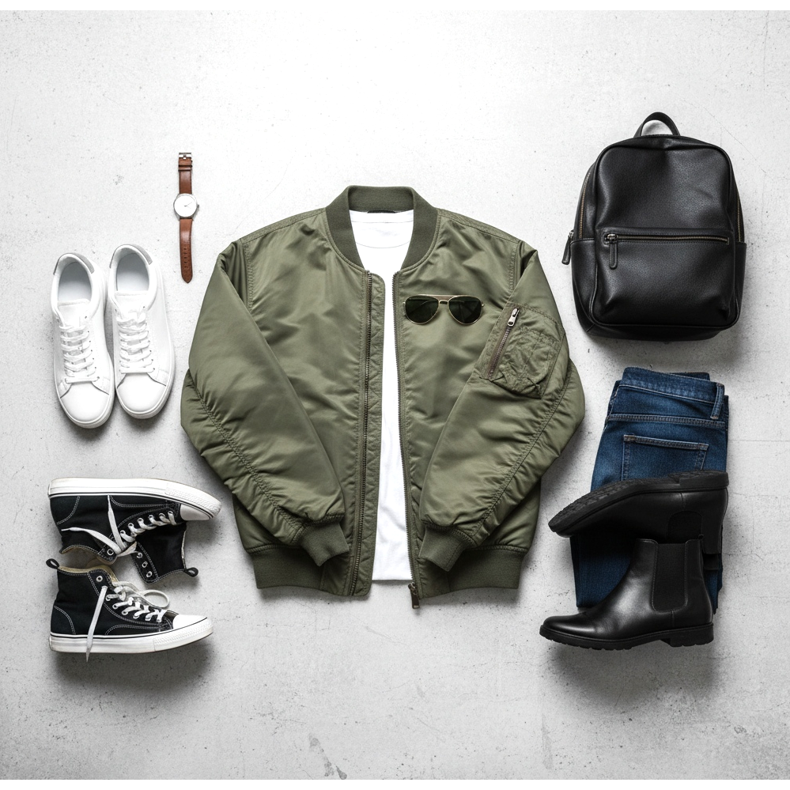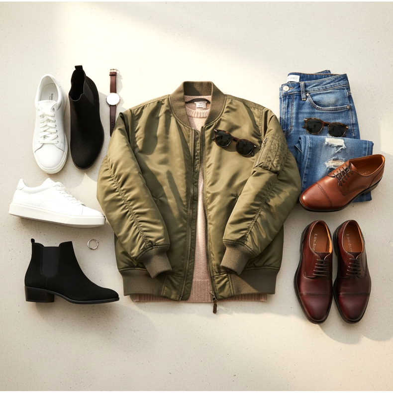 Per l'uso quotidiano, quando vai al lavoro, fai shopping o incontri gli amici, le scarpe comode che ti offriranno comfort tutto il giorno sono le migliori. Non solo sneakers, ma anche stivaletti, mocassini e perfino scarpe eleganti si abbinano perfettamente ad un bomber casual.