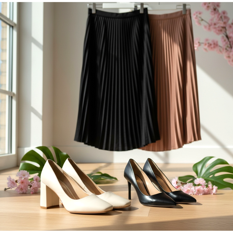L'abbinamento più famoso - gonna midi con tacchi o tacchi alti - funziona perché allunga la figura in modo naturale. Il tacco alto crea una linea verticale dal piede in su, che allunga otticamente le gambe e dona eleganza allo styling.