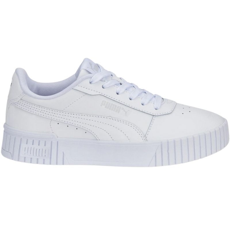 Il modello Carina 2.0 Jr, in colore bianco (numero di catalogo 386185 02), è caratterizzato dall'alta qualità di lavorazione tipica del rinomato marchio Puma. La tomaia della scarpa, progettata pensando alle esigenze dei bambini, è realizzata in pelle ecologica, che corrisponde alle tendenze ecologiche contemporanee e alla moda consapevole. Anche le perforazioni sulla parte anteriore e laterale della scarpa sono estremamente importanti, garantendo una migliore ventilazione del piede, fondamentale quando la si utilizza nelle giornate più calde.