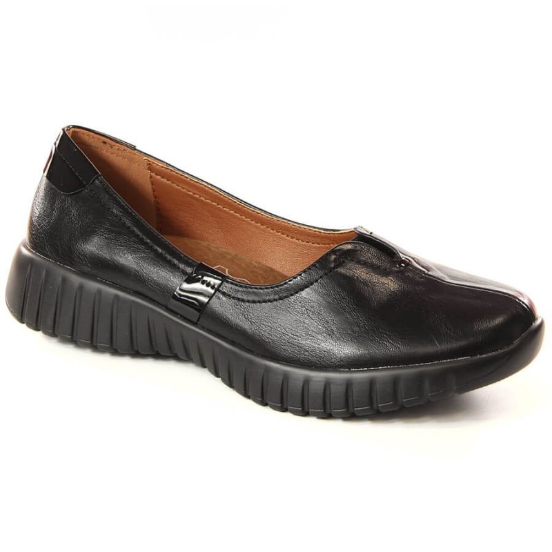 Scarpe da donna eleganti, confortevoli e universali Jezzi JEZ394 in nero, creata per uso quotidiano. Il modello basso con un dispositivo di fissaggio scorrevole è ideale per lavorare, per una passeggiata e per le riunioni sociali - combina il comfort dei mocassini con l'eleganza di metà ma.