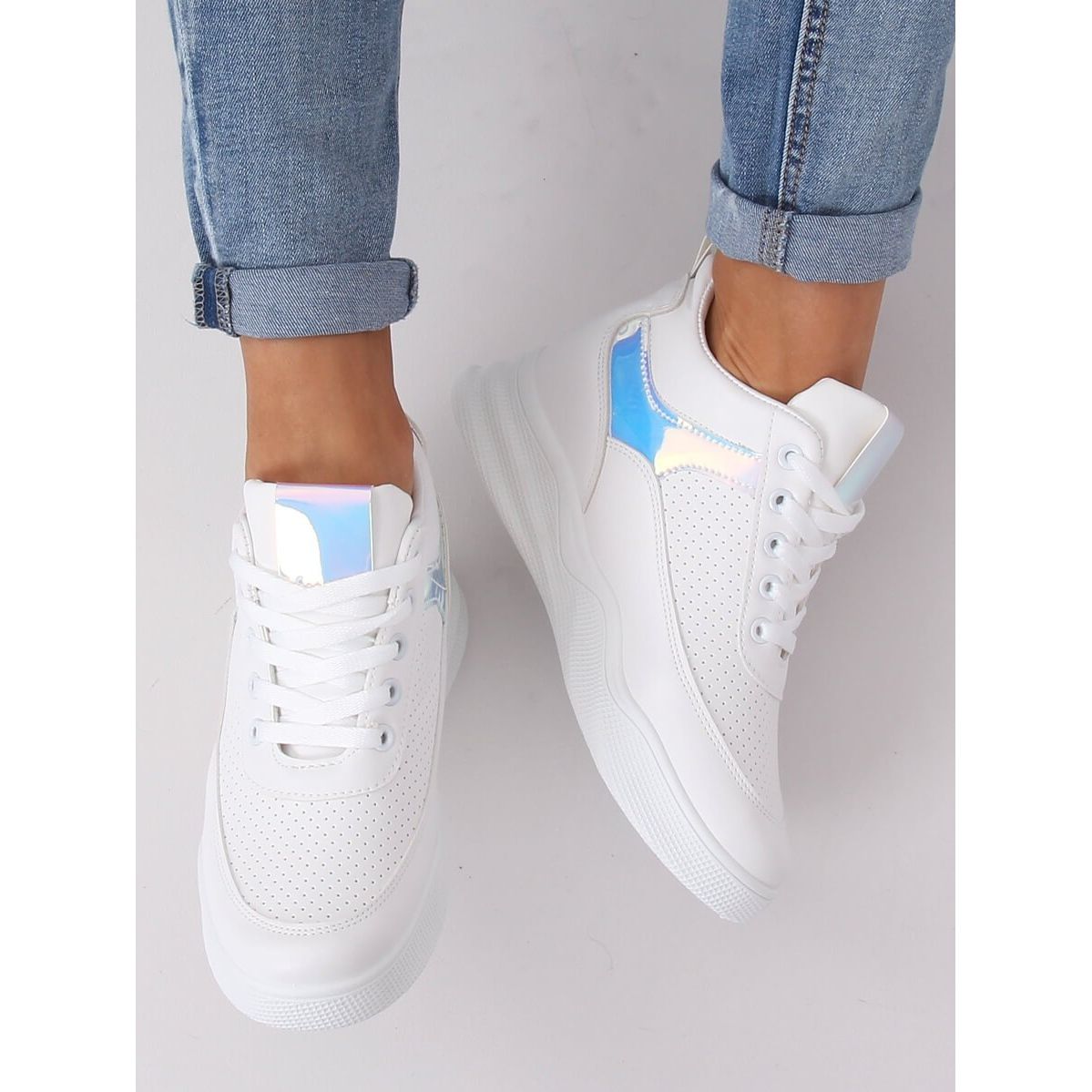 La loro caratteristica distintiva sono gli inserti verniciati e olografici, che conferiscono loro un carattere unico e originalità. Inoltre, l'accattivante texture traforata fa sì che queste scarpe non passino inosservate in qualsiasi outfit. Realizzati in pelle ecologica di alta qualità, garantiscono comfort di calzata e la suola sintetica fornisce un'ammortizzazione adeguata per l'uso quotidiano.