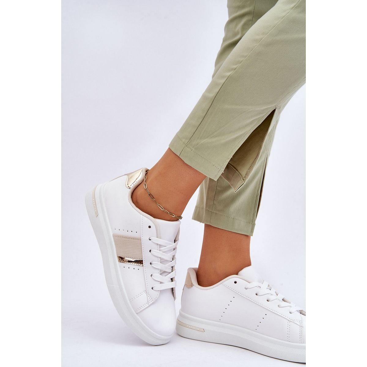 Queste sneakers uniche sono realizzate in ecopelle di alta qualità, unendo la cura per l'ambiente con resistenza ed estetica. Il loro vantaggio principale è una suola in plastica solida, che non solo fornisce un'ammortizzazione adeguata, ma aggiunge anche un carattere alla moda grazie ad un discreto rialzo di 3 centimetri.