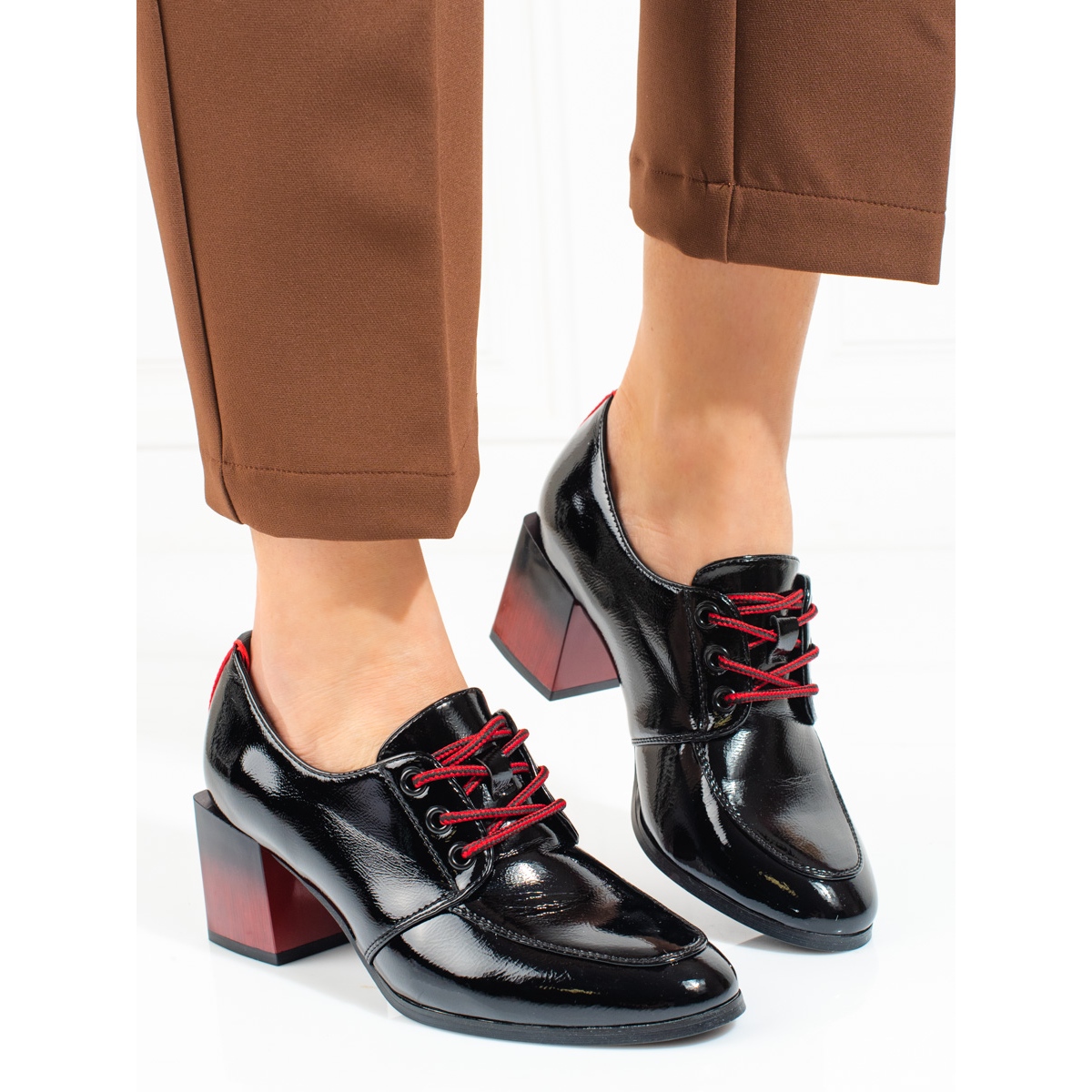 La tomaia delle scarpe è realizzata in similpelle di alta qualità e la finitura laccata conferisce un carattere elegante. L'interno delle scarpe è decorato con una combinazione di 50% pelle naturale e 50% similpelle, che garantisce un'adeguata ventilazione e una piacevole sensazione di indossabilità. Le suole in plastica nera e liscia garantiscono solidità e durata e la punta rotonda contribuisce all'aspetto attraente delle calzature.