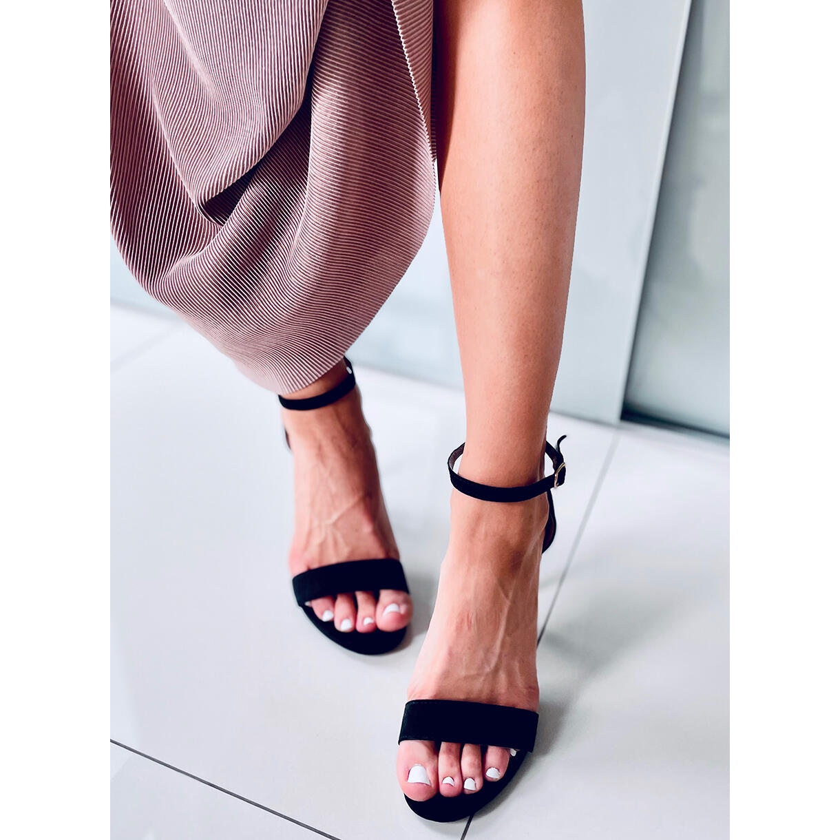 I sandali sono realizzati in pelle scamosciata ecologica, che garantisce non solo un look unico, ma anche rispetto per l'ambiente. Il taglio classico e un sottile cinturino che decora delicatamente la caviglia li rendono estremamente eleganti e raffinati. L'interno dei sandali è rivestito in pelle ecologica, che garantisce praticità e comfort una volta indossati.