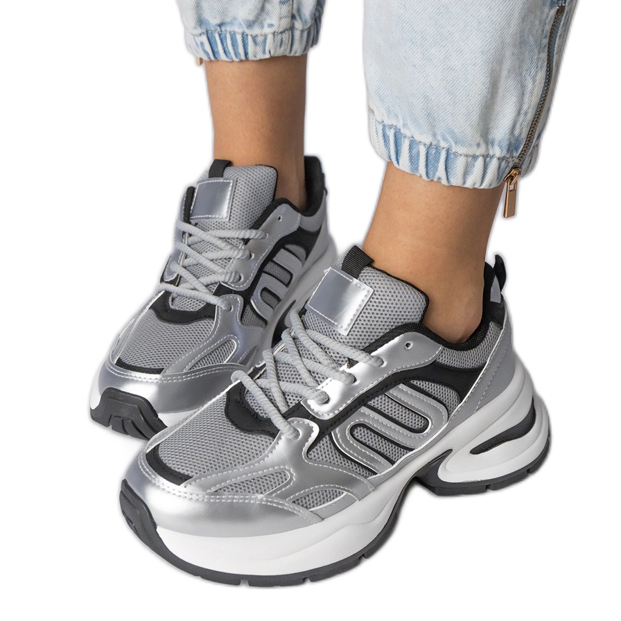 Silver Sports Sneaker su una suola enorme è una proposta che attirerà sicuramente l'attenzione di ogni donna alla moda. Il modello YY-9 L in un elegante colore d'argento combina stile e comfort moderni, perfettamente adattandosi alle tendenze attuali. La piattaforma alta da 6 cm garantisce un'ottima ammortizzazione, il che rende le scarpe perfette sia per le stilizzazioni quotidiane che per le attività sportive.