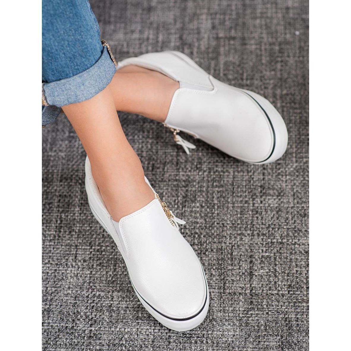 Scopri comfort e stile senza pari con le slip-on bianche con cerniera di SHELOVET. Queste sneakers da donna estremamente alla moda e dal design minimalista saranno perfette per qualsiasi stile di tutti i giorni. Il loro aspetto elegante è enfatizzato dalle cerniere dorate poste all'esterno della tomaia, che aggiungono un carattere moderno allo stile.