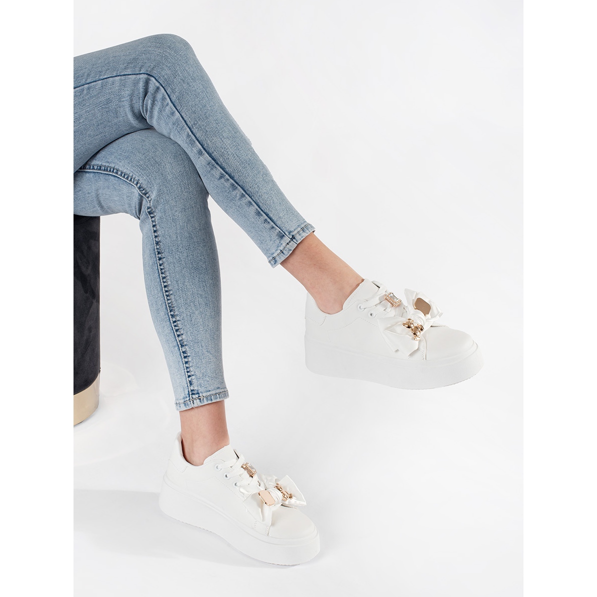 La stabilità del modello è fornita da una suola di plastica con un'altezza di 5 cm e una piattaforma alta 4 cm aggiunge uno stile sottile, abbinando vari stili. Gli accenti dorati in combinazione con le classiche sneaker bianche danno loro un carattere lussuoso, che li fa funzionare sia su base giornaliera che in occasioni più eleganti.