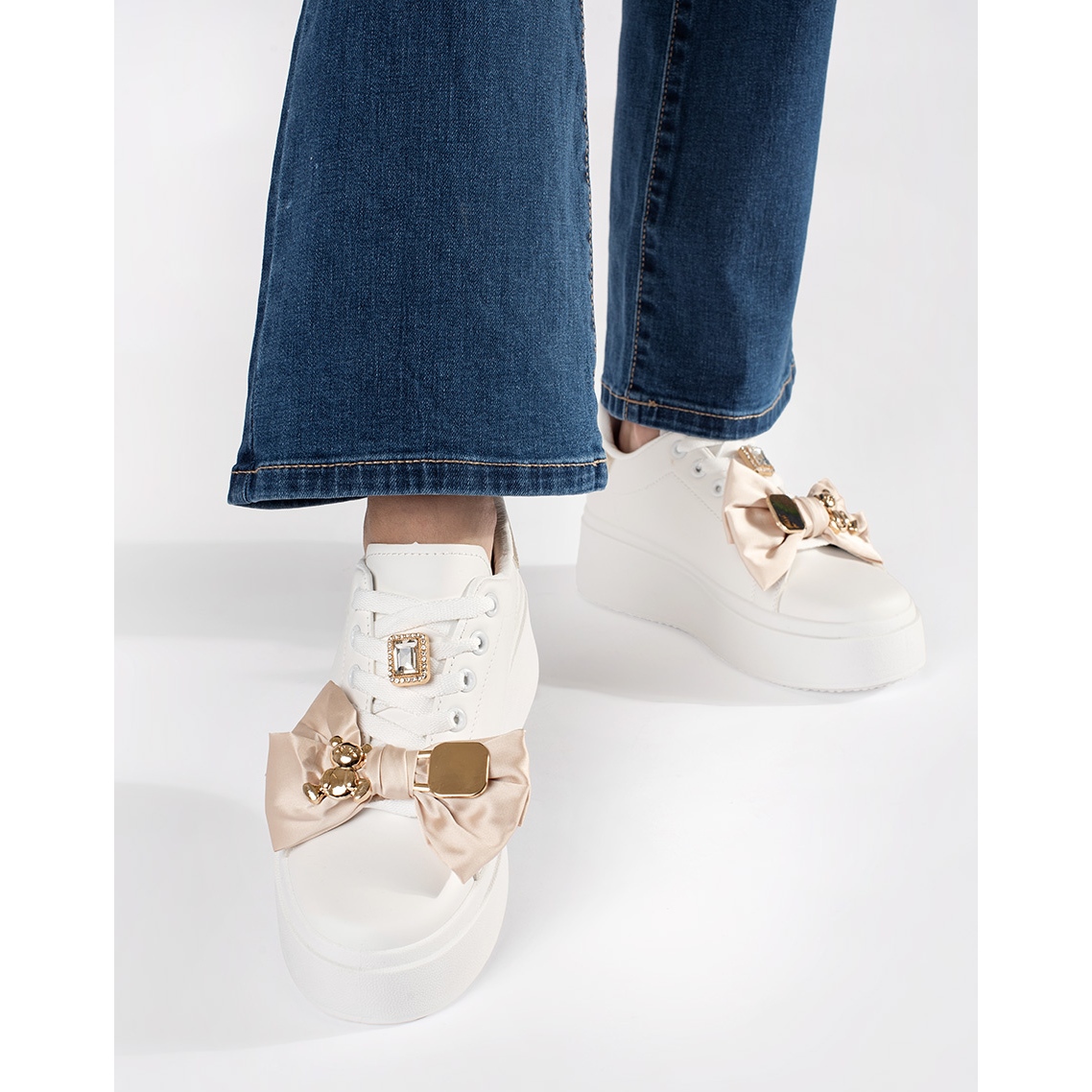 Le sneaker bianche e dorate con aggiunte dorate sono la scelta perfetta per le donne che vogliono combinare lo stile con il comfort. Queste eleganti scarpe sportive sono caratterizzate da un design alla moda, che combina un colore bianco universale con sottili accenti dorati. Grazie a questo, si adatteranno perfettamente a varie stilizzazioni, da casual a più eleganti.
