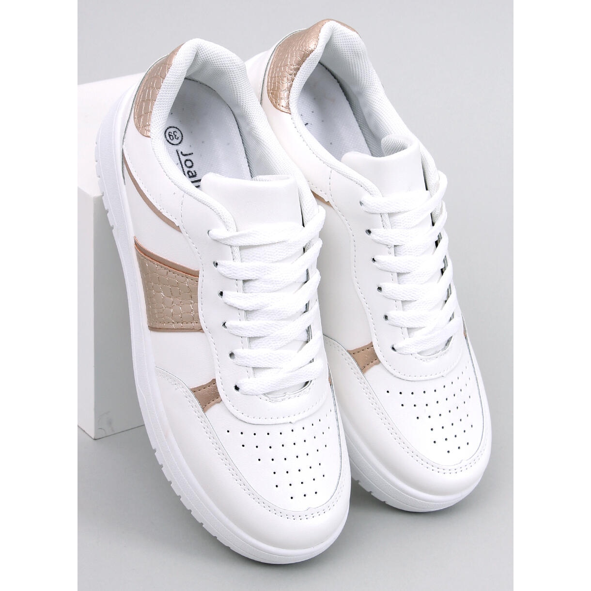 Le accattivanti sneakers bianche sono decorate con sottili accenti metallici dorati. La goffratura unica rende le scarpe non solo funzionali, ma anche un accessorio alla moda che completerà qualsiasi stile casual o anche più sofisticato.