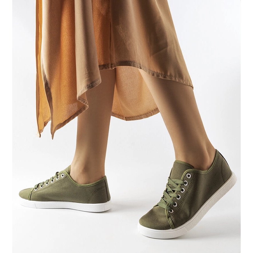 Sneakers eleganti Razan femminile in una tonalità di verde oliva (oliva). Scarpe basse e allacciate con una tomaia materiale e un inserto, su una suola di gomma bianca - perfette per le stilizzazioni di tutti i giorni, estive e primaverili.