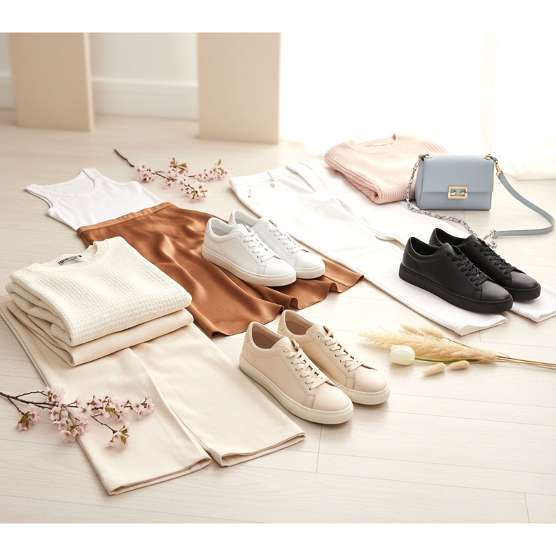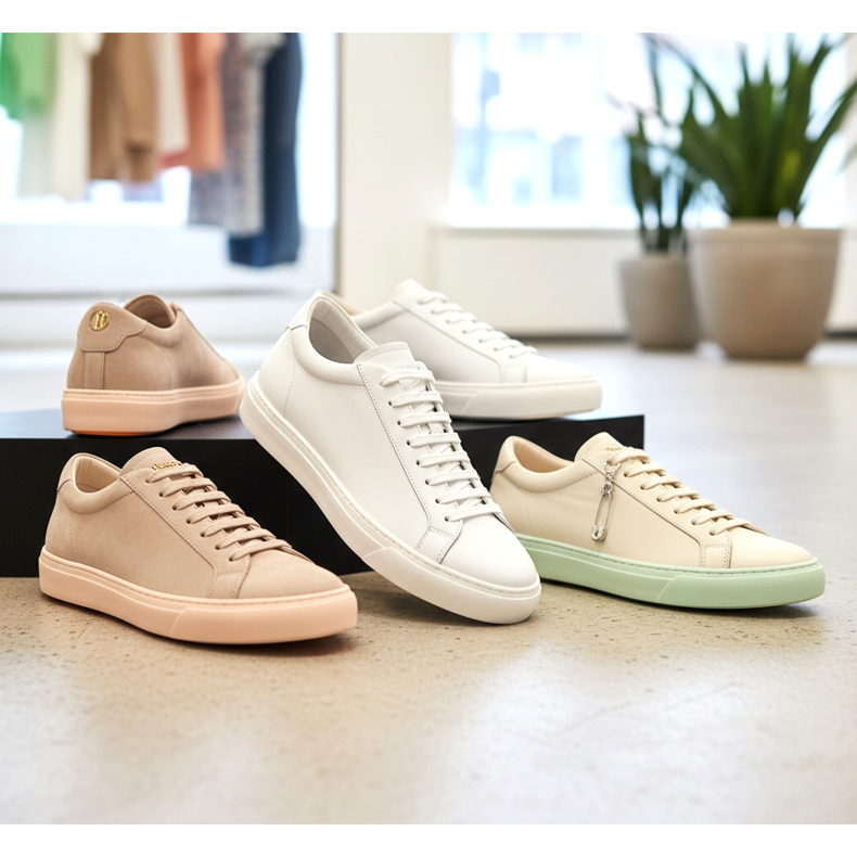 Se cerchi ispirazione, dai un'occhiata alle tendenze: le più desiderate nel 2026 sono le sneakers ultraslim bianche e crema, realizzate in pelle pieno fiore con cuciture ed elementi decorativi minimi. Una suola bianca sullo sfondo nel piè di pagina è il minimo assoluto.