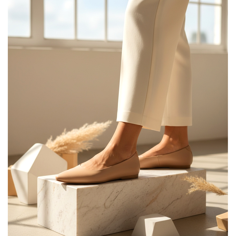 Tuttavia, il design ultrasottile della scarpa, il suo profilo sottile e la punta allungata, spesso compensa la mancanza del tacco. Le gambe di queste scarpe sembrano più lunghe rispetto alle tradizionali sneakers piatte con punta rotonda e suola spessa. Un paio di un colore simile alla carnagione o al beige è particolarmente consigliato per le persone più basse: l'effetto di allungamento ottico è davvero evidente.