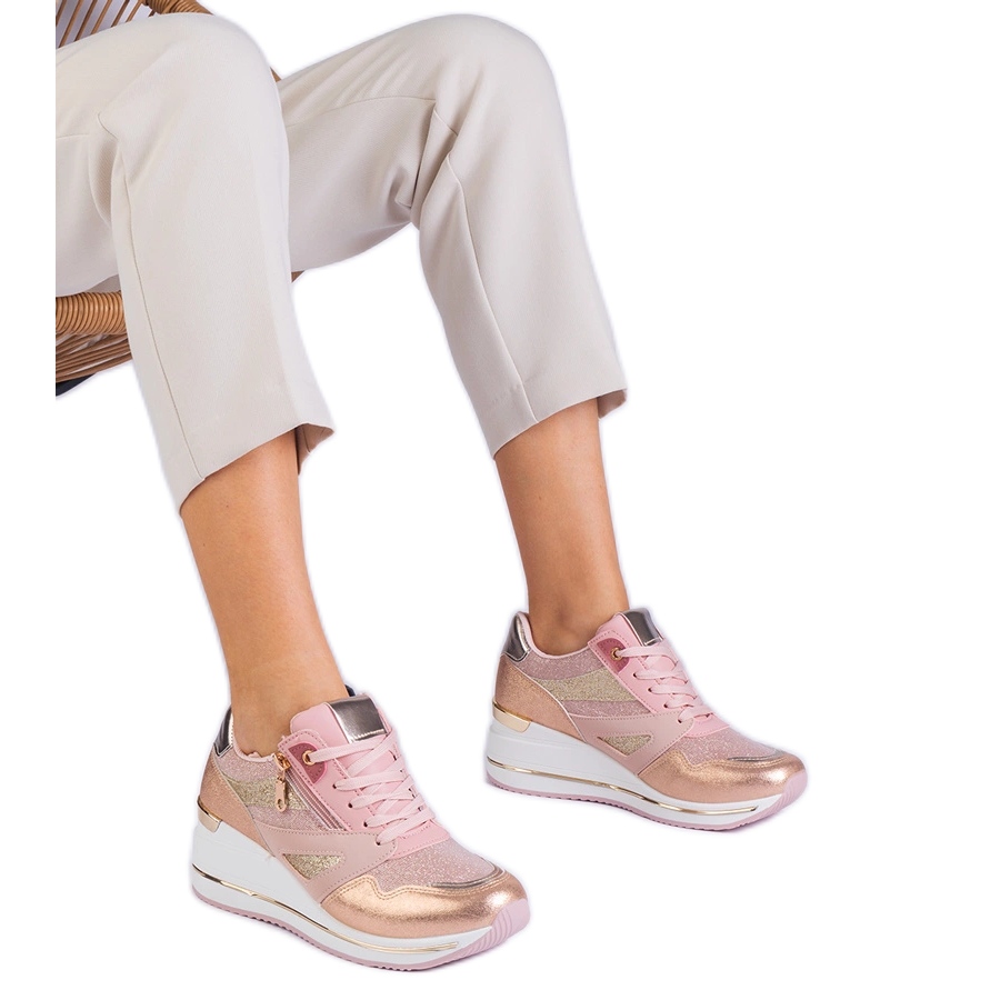 Sneaker sport rosa sulla piattaforma decorate con glitter e un inserto metallico