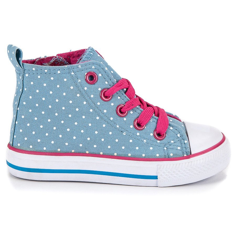 Deliziose sneakers azzurre con pois bianchi, perfette per l'uso quotidiano e come scarpe per la scuola. La tomaia in tessuto traspirante arriva sopra la caviglia, garantendo stabilità e un look alla moda. Le scarpe sono allacciate con lacci rosa a contrasto e una pratica cerniera laterale le rende facili da indossare e togliere, perfette per i bambini che vogliono essere indipendenti.