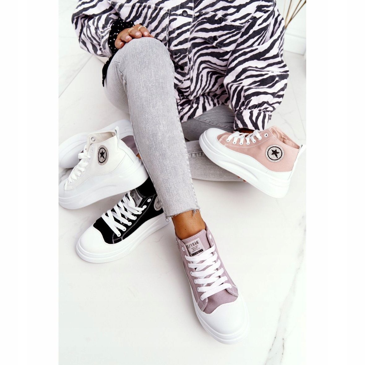 Le sneakers sono disponibili nel classico colore nero con suola bianca, che le rende estremamente universali e facili da abbinare al resto del tuo guardaroba. Un ulteriore vantaggio sono gli strass, che aggiungono un po' di brillantezza e li rendono un elemento di styling originale.