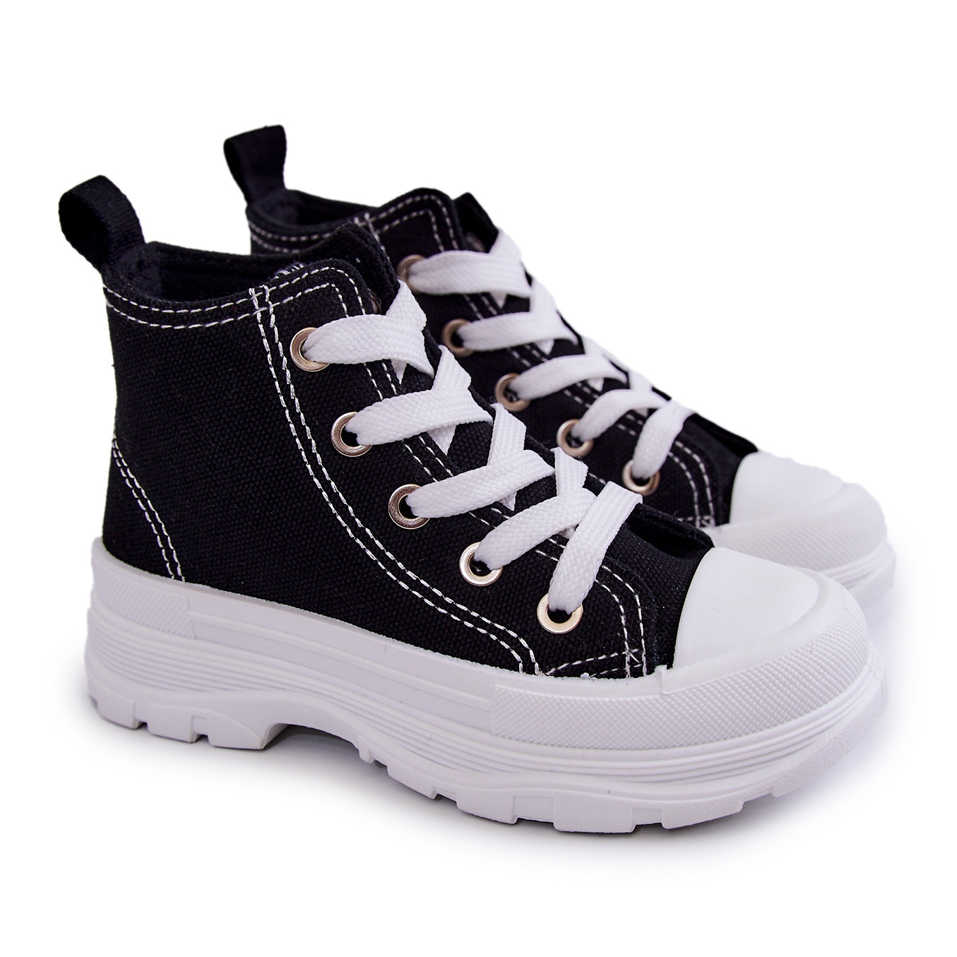 Le sneakers sono disponibili in un elegante colore nero con accenti bianchi, che le rende abbinabili a molti stili. L'altezza superiore è di 7,5 cm per la taglia 24 e la suola piatta con un'altezza di 1,5 cm garantisce inoltre stabilità.