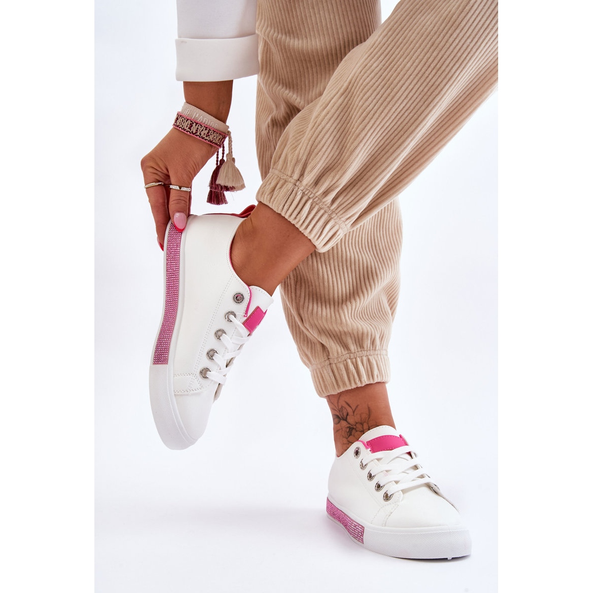 Scopri stile e comodità unici con le sneakers basse da donna con strass in un bellissimo colore bianco e rosa di Demira. Questo modello intramontabile non dovrebbe mancare nel guardaroba di ogni donna e offre innumerevoli possibilità di styling. Si abbinano perfettamente sia ai jeans casual che agli abiti ariosi, aggiungendo carattere a qualsiasi outfit.