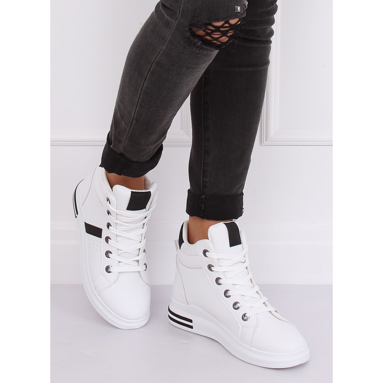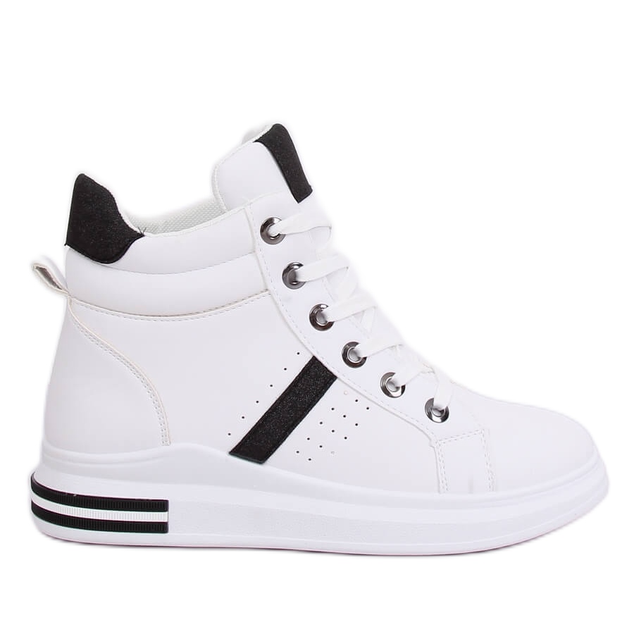 Conosci le sneakers alte bianche CB-19078 WHITE/BLACK - perfette per ogni occasione! Queste sneakers stringate da donna attirano l'attenzione con la loro forma elegante e gli inserti glitterati lucenti, che conferiscono loro un carattere unico. La suola alta, alta 3 cm, non solo aumenta il comfort, ma crea anche un look alla moda che si abbina perfettamente a vari stili.