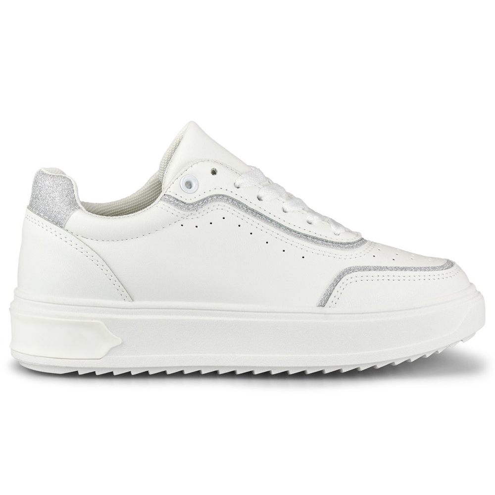 Le scarpe da ginnastica classiche, femminili e comode bianche con sottili accenti d'argento sono la stagione primaverile/estiva. Realizzato in pelle ecologica di alta qualità, su una piattaforma stabile da 2,5 cm, combina un personaggio sportivo con uno stile urbano alla moda. Perfetto per una base giornaliera - per jeans, abiti o una gonna casual.