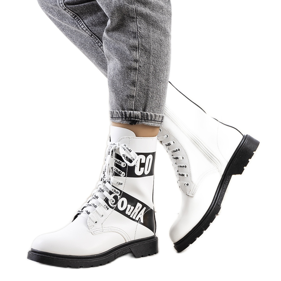 Ottimo per look casual - jeans, merci, maglioni di grandi dimensioni e abiti da ragazze con collant spessi. I trapper bianchi con iscrizioni aggiungeranno il carattere di ogni stilizzazione e attireranno sguardi.
