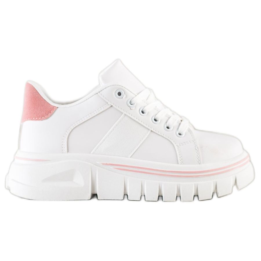 Le sneakers si distinguono per uno spesso plateau di 4,5 centimetri, che non solo aggiunge qualche centimetro di altezza, ma fornisce anche un solido sostegno durante la giornata. Grazie al battistrada chiaro ti sentirai sicuro su varie superfici! La tomaia in pelle ecologica nel classico colore bianco garantisce universalità, e un sottile inserto rosa in pelle scamosciata aggiunge un accento delicato.