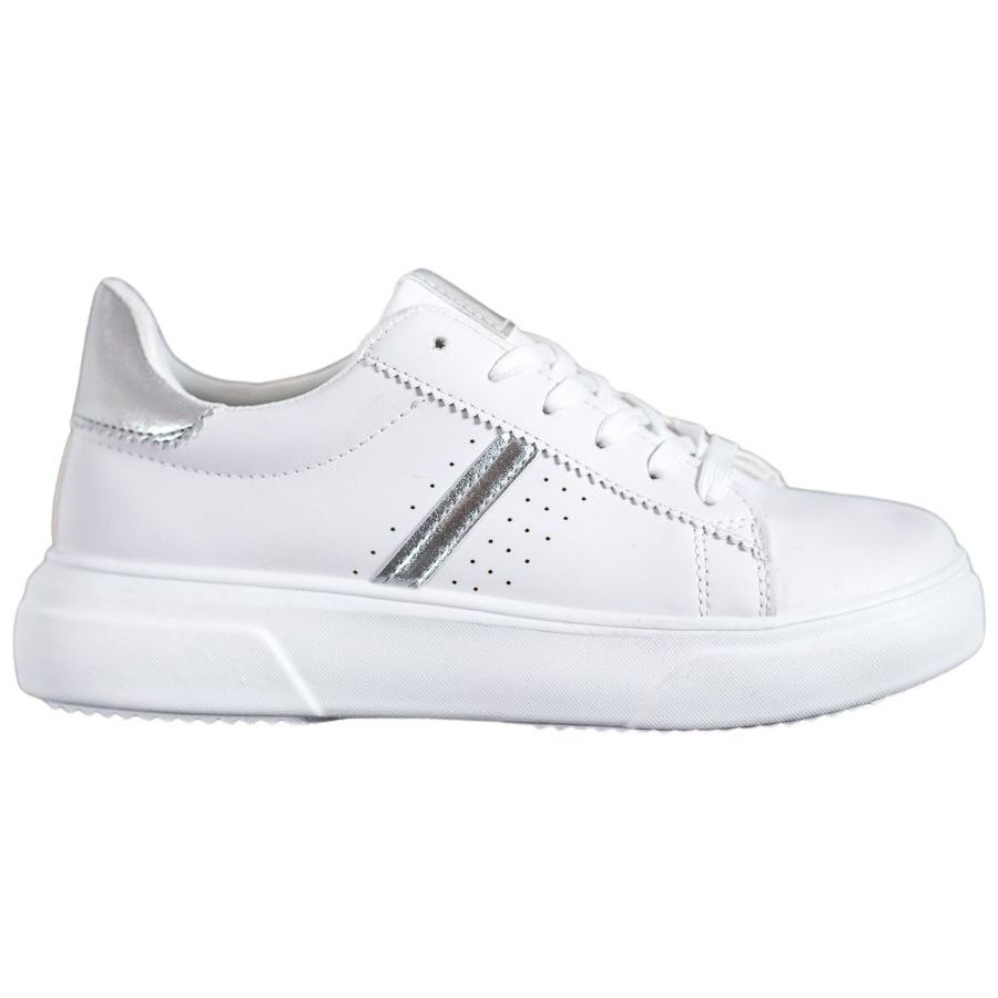 Gli accenti argentati posizionati sul lato e sul retro delle scarpe conferiscono loro un carattere unico, e le file decorative di fori sui lati completano il tutto con un accento moderno. Grazie alla piattaforma bianca di 4 centimetri, le sneakers non solo hanno un bell'aspetto, ma garantiscono anche comfort durante l'uso tutto il giorno.