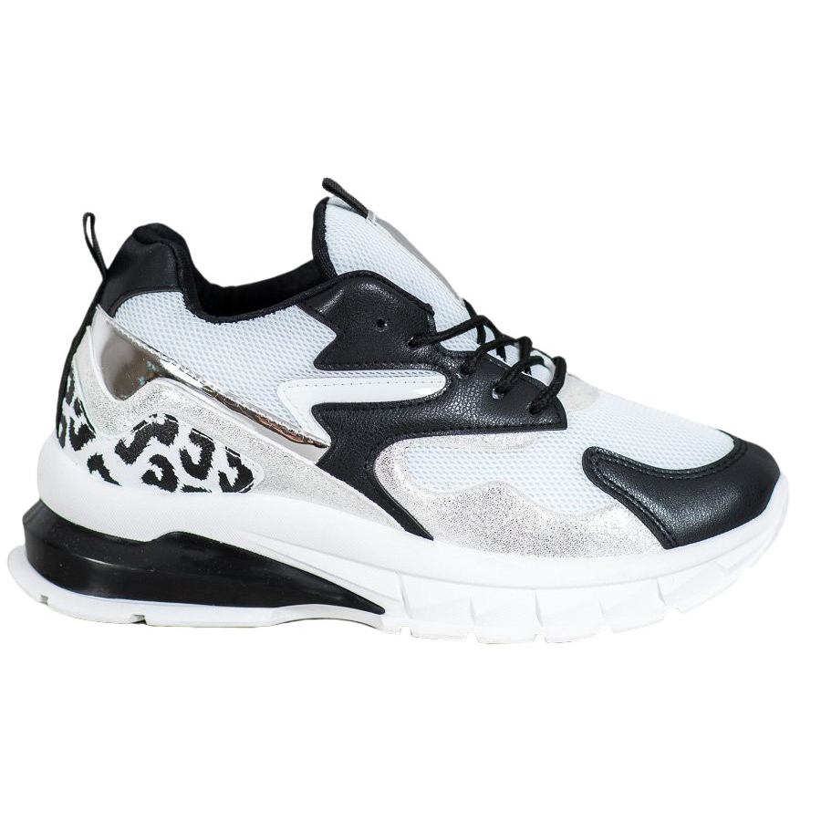 Realizzata in materiale di alta qualità, la parte esterna delle scarpe colpisce per la tomaia bianca decorata con inserti neri di varie forme e dimensioni. Inoltre, ci sono accenti argentati sul lato e sopra il tallone, che conferiscono alle sneakers un look unico e moderno. Un tallone morbido e chiuso e una decorazione originale con motivo maculato garantiscono comfort di indossamento e allo stesso tempo attirano l'attenzione.