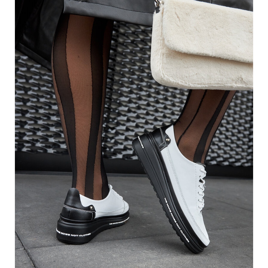 La suola in gomma nera garantisce buona presa e stabilità, mentre la zeppa bassa (altezza 4 cm) aggiunge un'eleganza discreta e allunga otticamente la gamba. La punta rotonda rende le sneakers comode e non limita i movimenti, il che le rende perfette per le attività quotidiane.