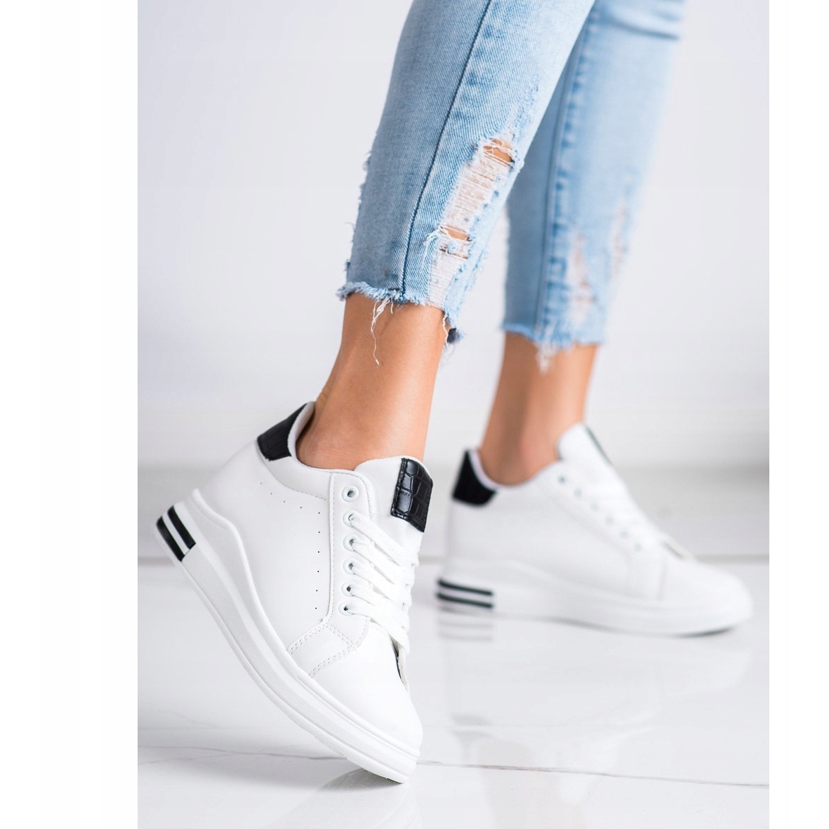 Grazie alla zeppa nascosta di 5 centimetri guadagnerai qualche centimetro in altezza, che metterà in risalto la tua figura senza rinunciare alla comodità. Le sneakers bianche con inserti neri si adattano perfettamente alle tendenze attuali, permettendoti di abbinarle facilmente a vari capi di abbigliamento, dai jeans agli abiti ariosi.