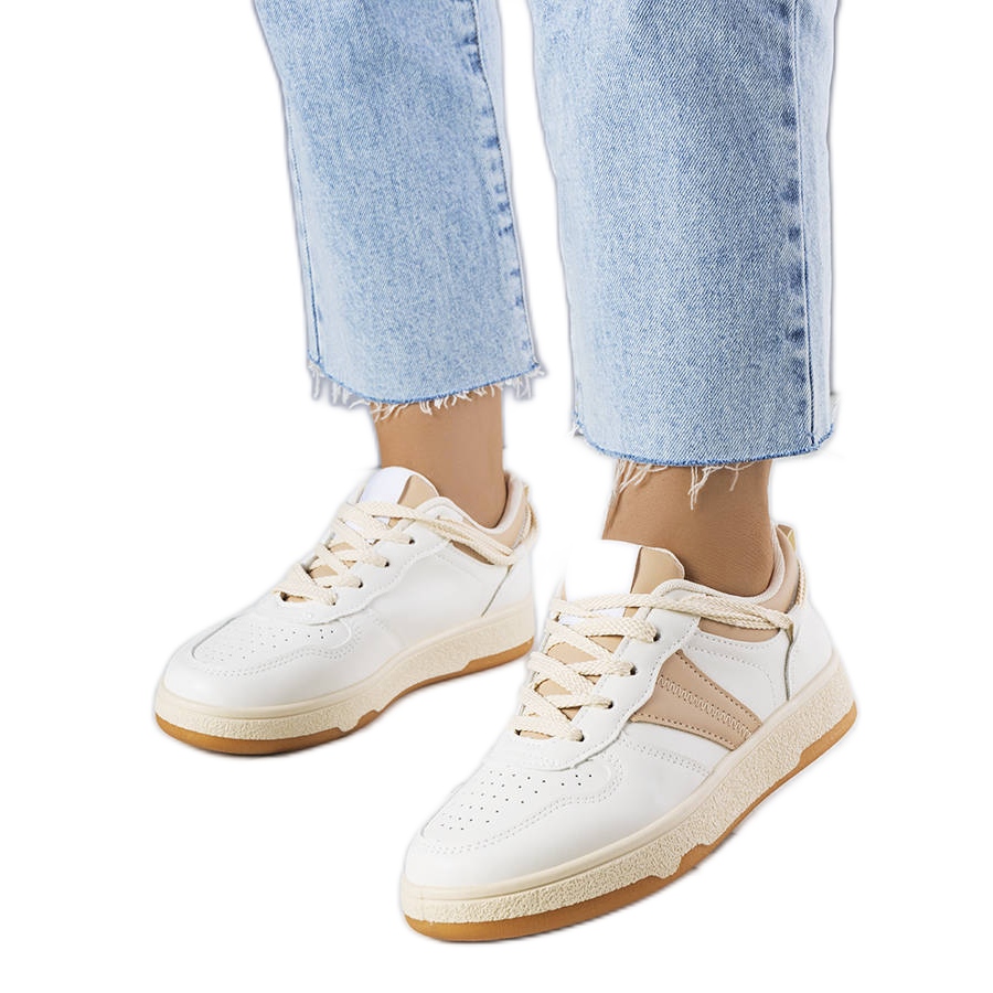 Le scarpe da ginnastica Marcella in un colore beige universale combinano l'atmosfera retrò degli anni '90 con le tendenze attuali. La parte superiore in pelle ecologica di alta qualità è stata decorata con molti inserti e un battistrada contrastante e una punta rotonda perforata aggiunge carattere e leggerezza. I lacci selezionati a colori per gli inserti enfatizzano l'estetica coerente della scarpa. Bassa fattura (circa 10 cm di altezza della tomaia) e una piattaforma alta 3 cm garantisce un comfort stabile e giornaliero.