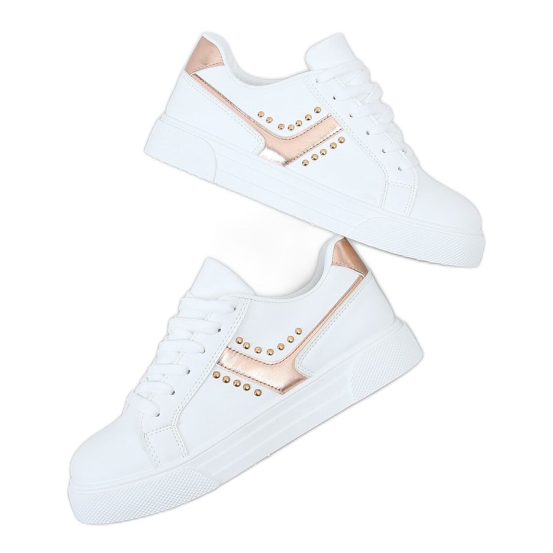 Scopri la moda in un solo passaggio grazie alle sneakers da donna 1063 Champagne bianco! Queste scarpe stringate uniche piaceranno a tutti gli appassionati di stili originali. Il taglio classico, combinato con borchie accattivanti, rende questo modello sicuro di attirare l'attenzione e completare molti stili di tutti i giorni.
