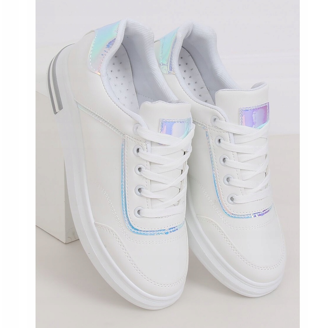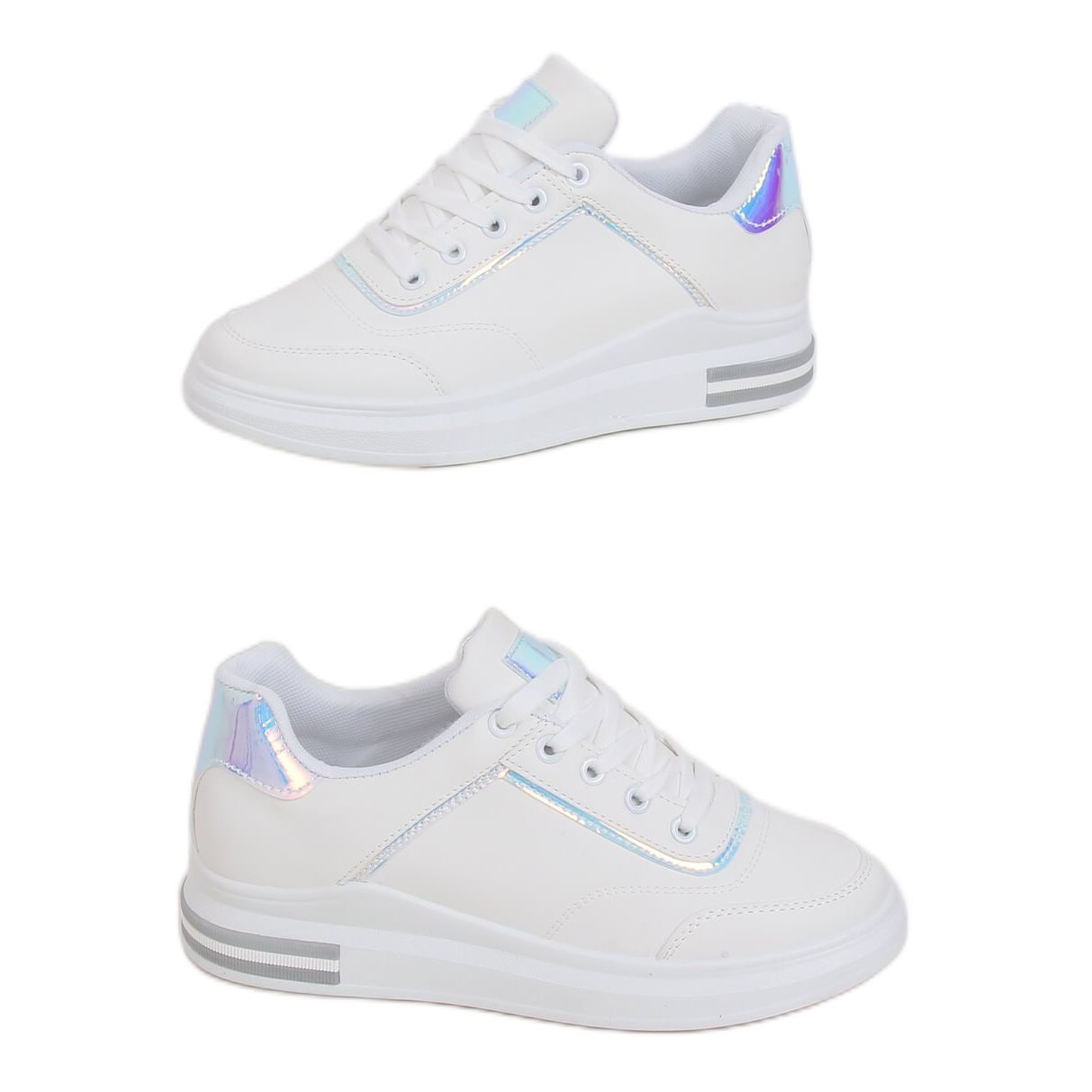 Realizzate in pelle ecologica di alta qualità, queste sneakers colpiscono per gli accessori olografici che conferiscono loro un carattere unico. L'interno delle scarpe è rivestito in morbido tessuto, che garantisce comfort quando indossato, anche per lunghe ore. La punta tonda e la classica chiusura con lacci li rendono non solo alla moda, ma anche funzionali.