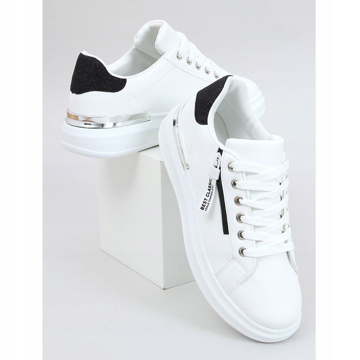 Scopri l'ultimo modello di sneakers bianche da donna F006 WHITE/BLACK, che arricchirà sicuramente il tuo guardaroba! Queste scarpe eleganti e comode sono una combinazione perfetta di accenti alla moda e comfort nell'indossarle. La loro costruzione in pieno fiore e allacciata assicura una perfetta aderenza al piede, e gli inserti glitterati conferiscono loro un carattere unico, rendendo il tuo styling ancora più interessante.