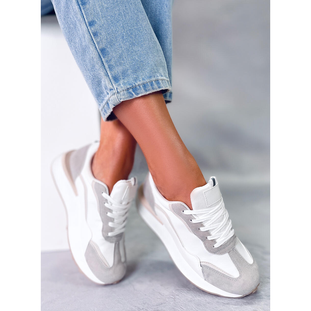 Presentiamo le sneakers da donna Mabel in una combinazione di colori alla moda Bianco/Beige/Grigio! Queste scarpe sportive uniche con suola alta sono la scelta perfetta per ogni donna che apprezza lo stile e il comfort. Realizzati con materiali durevoli - una combinazione di tessuto, pelle ecologica e pelle scamosciata - garantiscono non solo un aspetto attraente, ma anche comfort ad ogni passo.