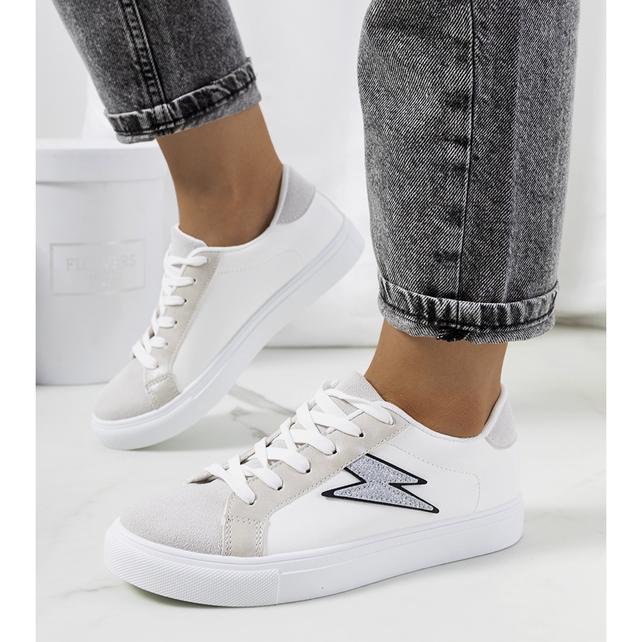 La tomaia delle sneakers è realizzata in pelle ecologica, decorata con un sottile motivo in stile coccodrillo, che conferisce loro un carattere unico. I colori - bianco con una punta di argento e grigio - fanno sì che le calzature si adattino perfettamente sia ad outfit casual che più eleganti.