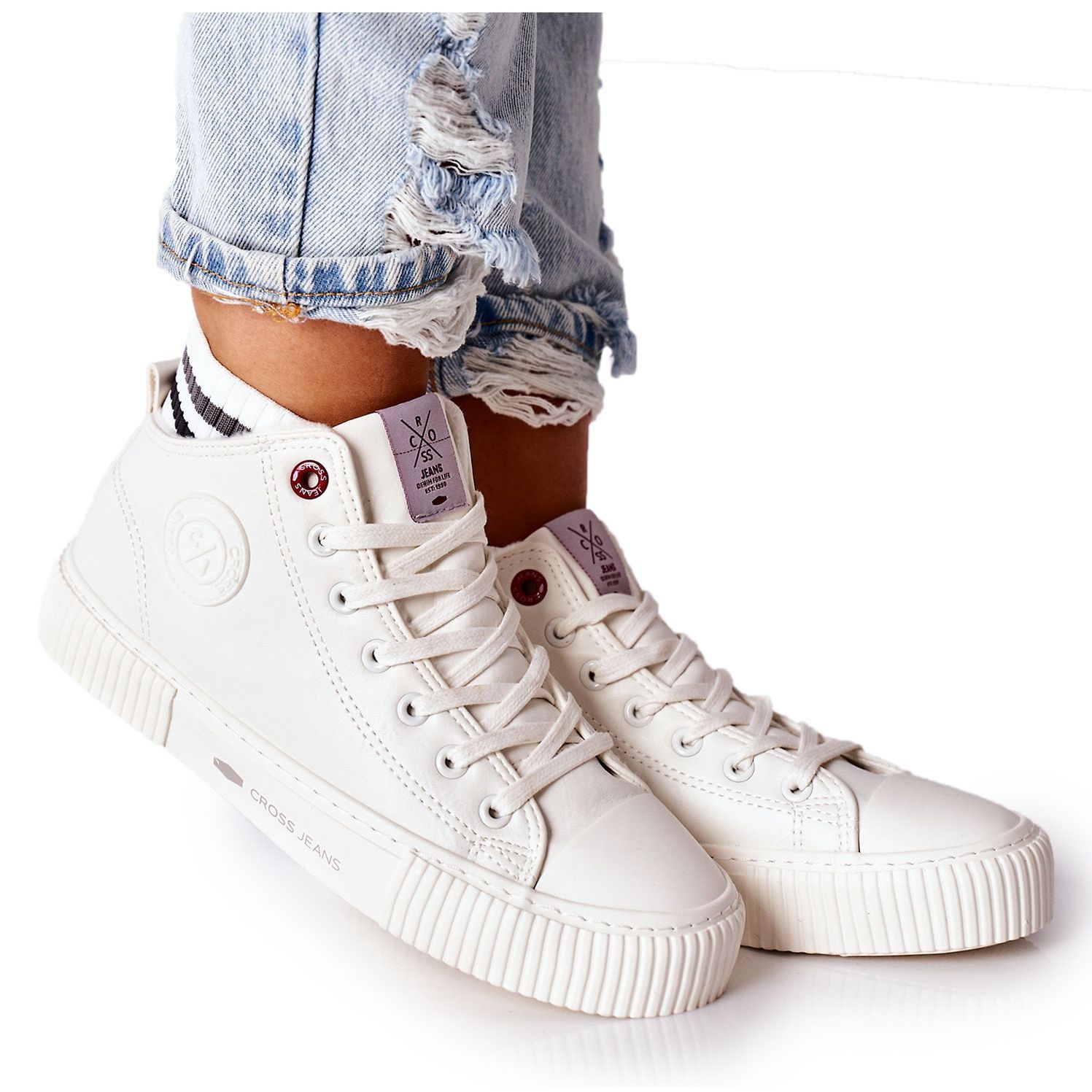 Le sneaker da donna incrociano i jeans Wysokie White II2R4022 - Classico in un'edizione moderna. Sneaker eleganti e alte in pelle ecologica, che combinano un look alla moda con il comfort quotidiano. Perfetto per gli stili urbani - dai jeans agli abiti estivi.