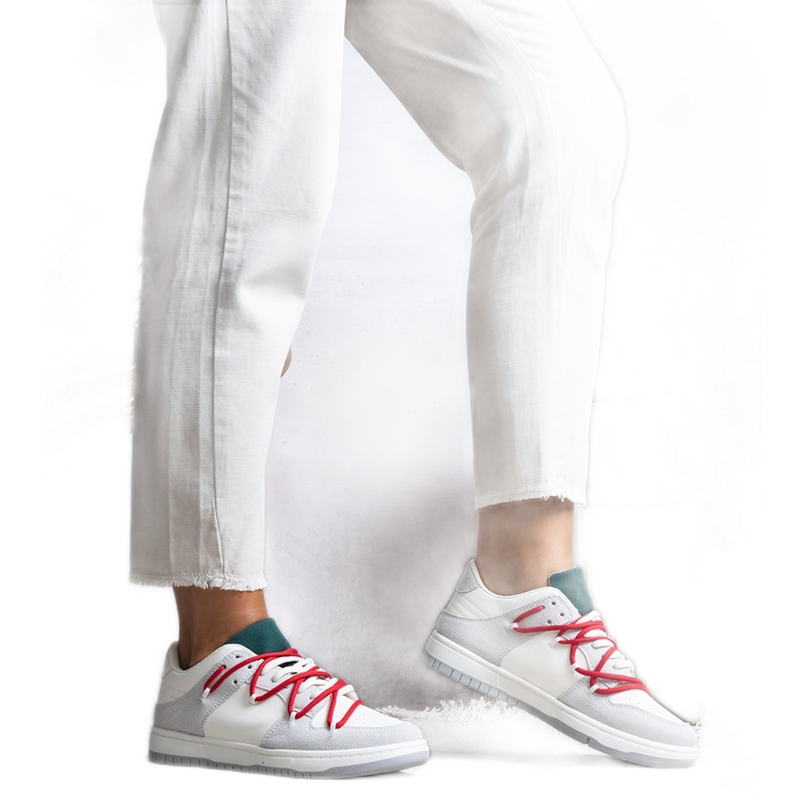 Sneaker da donna moderna che combinano un personaggio sportivo con lo stile urbano. Il colore principale è bianco con accenti grigi e lacci rossi espressivi che danno alle scarpe un aspetto fresco e alla moda. La suola più spessa da 3 cm è un successo della stagione: fornisce comfort e solleva leggermente la figura.