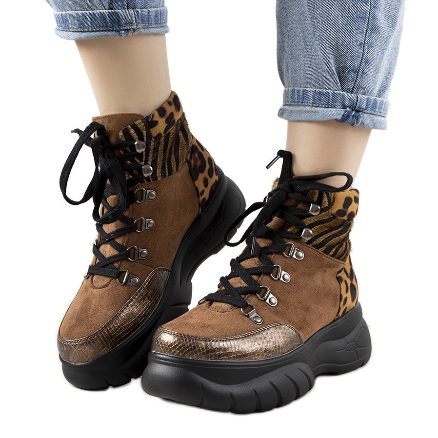 Scopri il fascino delle sneakers invernali marroni con motivo animale di Cesaria, una scelta perfetta per l'uso quotidiano. Questi eleganti stivali sono realizzati in pelle scamosciata ecologica, che garantisce sia un look elegante che comfort da indossare. Gli inserti con motivi animalier conferiscono loro un carattere unico, attirando l'attenzione e distinguendosi dagli altri modelli.