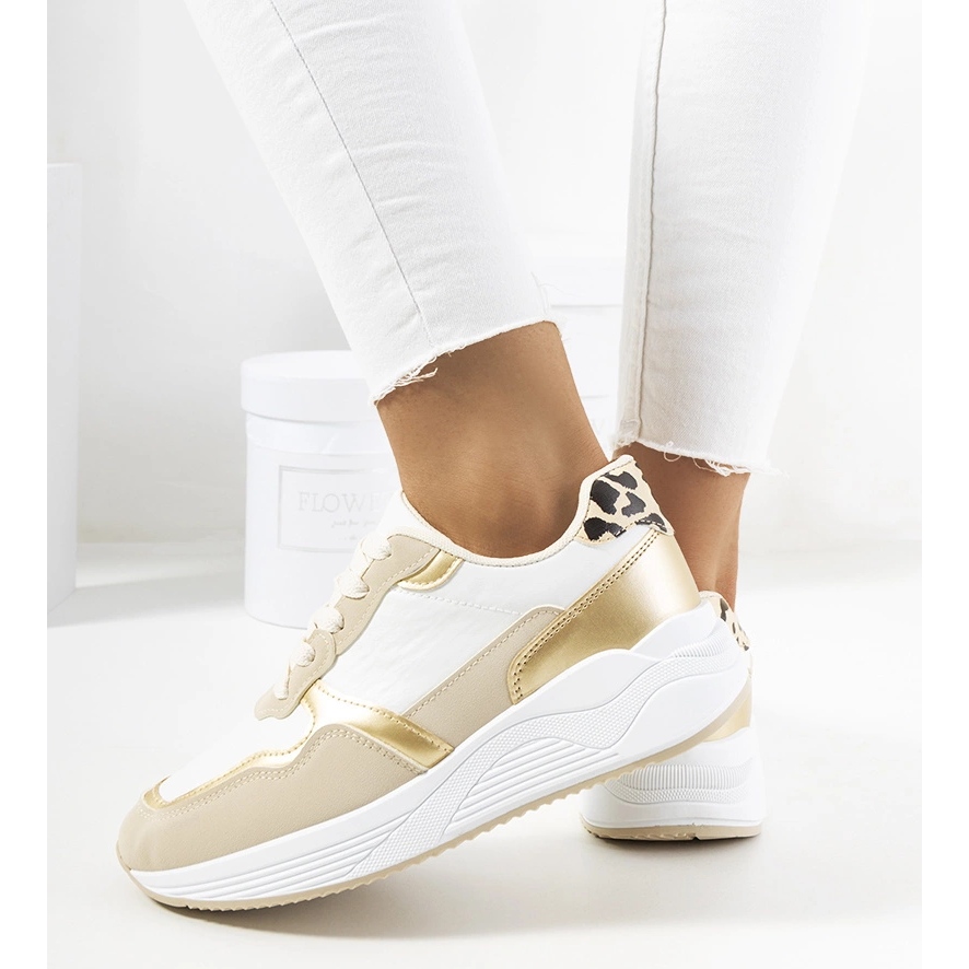 Sneaker da donna beige realizzate in pelle ecologica di alta qualità. Un modello superiore basso (circa 10,5 cm) con naso arrotondato, chiusura allacciata e una suola in gomma bianca. Gli occhi sono attratti da accenti metallici e un delicato inserto nella stampa leopardata, che aggiunge un carattere alla moda. Una suola con una piattaforma/tacco ca. 4 cm modella bene la figura. Inserto del materiale, nessun isolamento. Numerazione standard - Scegli le dimensioni ordinarie. Il prodotto nella scatola originale.